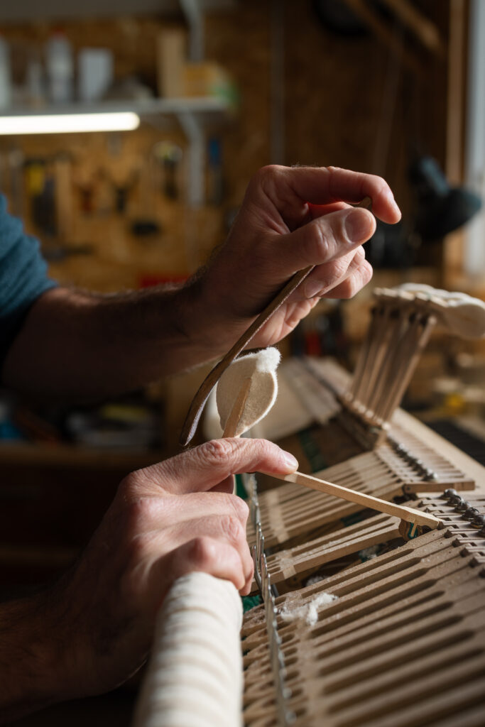 L’harmonisation permet d’équilibrer le son en travaillant sur les harmoniques produites par les marteaux au contact des cordes. C’est une étape de finition essentielle pour affiner le timbre, homogénéiser le rendu et donner au piano la couleur sonore qui lui correspond.